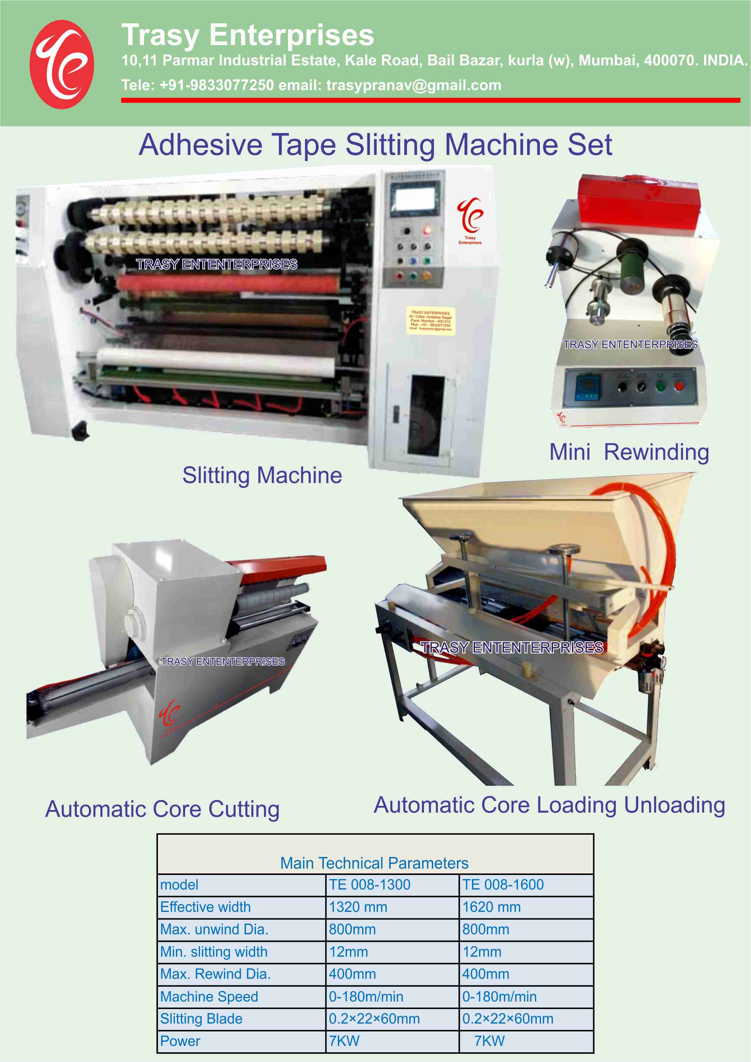 A set of Machines for : Core cutting, Core loading and unloading, Adhesive Tape Slitting and Mini Doctor Rewind High speed machine, one can convert about 100 boxes ( 72 rolls in a box) in 8 hours or a Jumbo roll of 4000 metres can be converted in 1 hour 45 minutes. Required space for the set up is at least 1000 sqft area. With 10 HP power. Rs. 9 Lakh +18% GST. FOB Mumbai. ( Excludes Compressor)