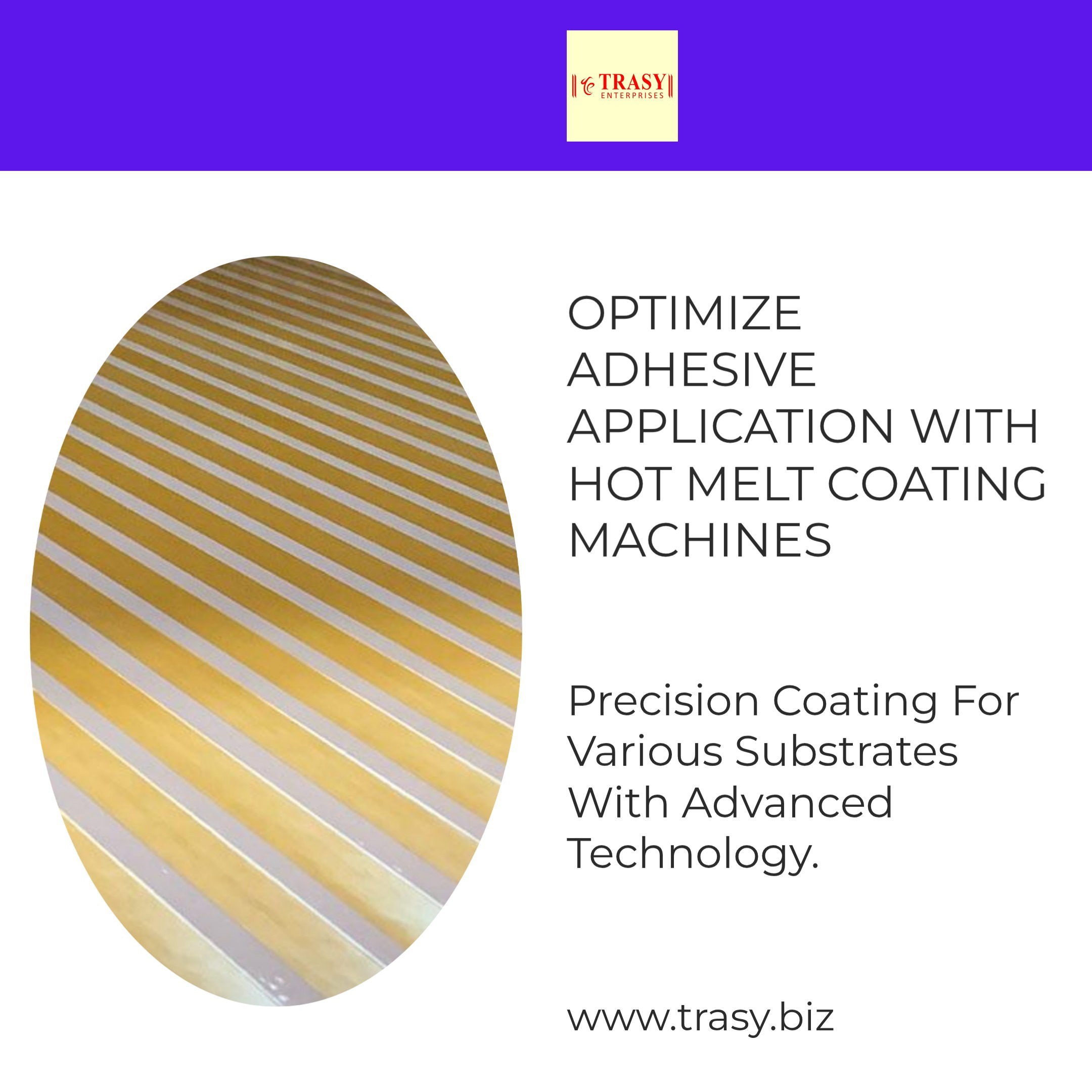 ⚙️ While standard machines apply a continuous adhesive layer, Trasy can support pattern / stripe coating configurations using appropriate coating heads (like engraved or patterned slot dies) or intermittent control within hot melt coating lines. These are typically custom solutions based on substrate width, adhesive type, and stripe pattern requirements. hotmeltmachines.in